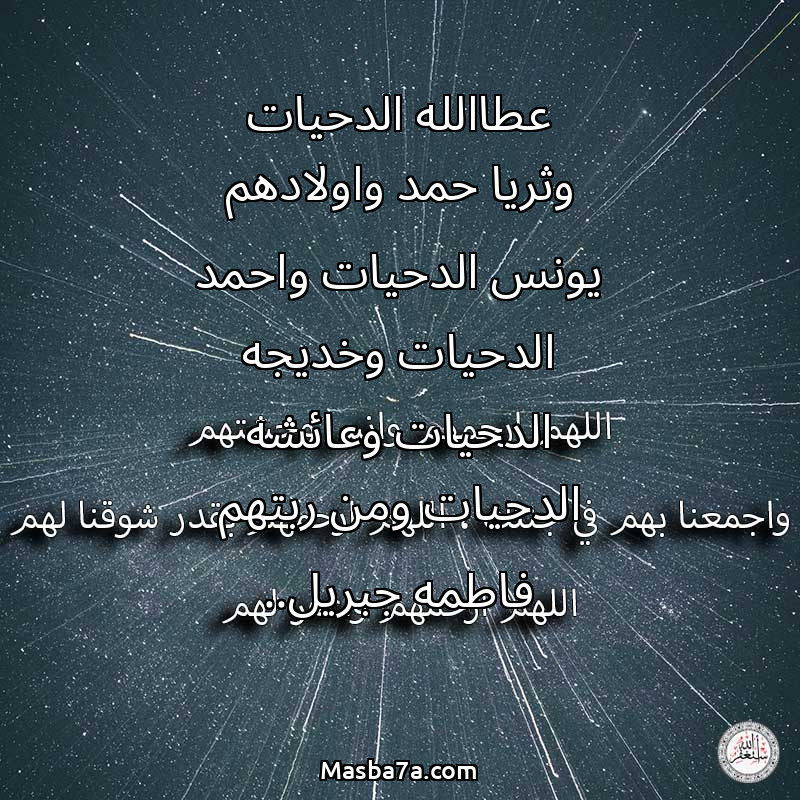 اللهم ارحم ( عطاالله الدحيات وثريا حمد واولادهم يونس الدحيات واحمد الدحيات وخديجه الدحيات وعائشه الدحيات ومن ربتهم فاطمه جبريل.. ) وانس وحشتهم واجمعنا بهم في جنتك ، اللهم ارحمهم بقدر شوقنا لهم اللهم ارحمهم واغفر لهم.