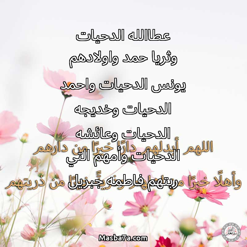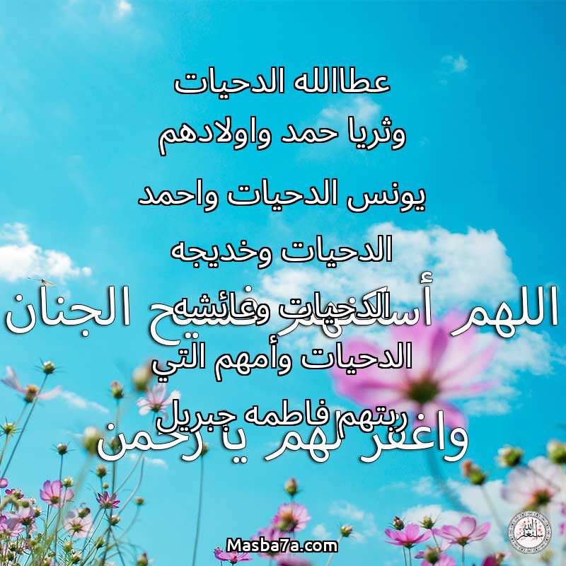 اللهم ارحم ( عطاالله الدحيات وثريا حمد واولادهم يونس الدحيات واحمد الدحيات وخديجه الدحيات وعائشه الدحيات وأمهم التي ربتهم فاطمه جبريل ) وانس وحشتهم واجمعنا بهم في جنتك ، اللهم ارحمهم بقدر شوقنا لهم اللهم ارحمهم واغفر لهم.