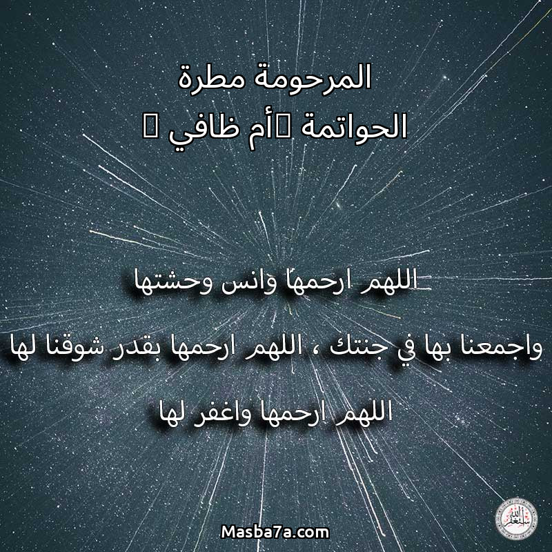 اللهم ارحم ( المرحومة مطرة الحواتمة (أم ظافي ) ) وانس وحشتها واجمعنا بها في جنتك ، اللهم ارحمها بقدر شوقنا لها اللهم ارحمها واغفر لها .