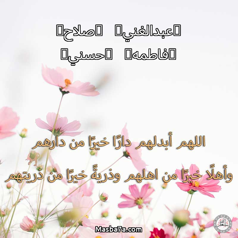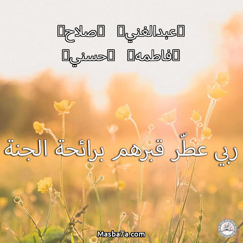 اللهم ارحم ( (عبدالغني) - (صلاح) - (فاطمه) - (حسني) ) وانس وحشتهم واجمعنا بهم في جنتك ، اللهم ارحمهم بقدر شوقنا لهم اللهم ارحمهم واغفر لهم.