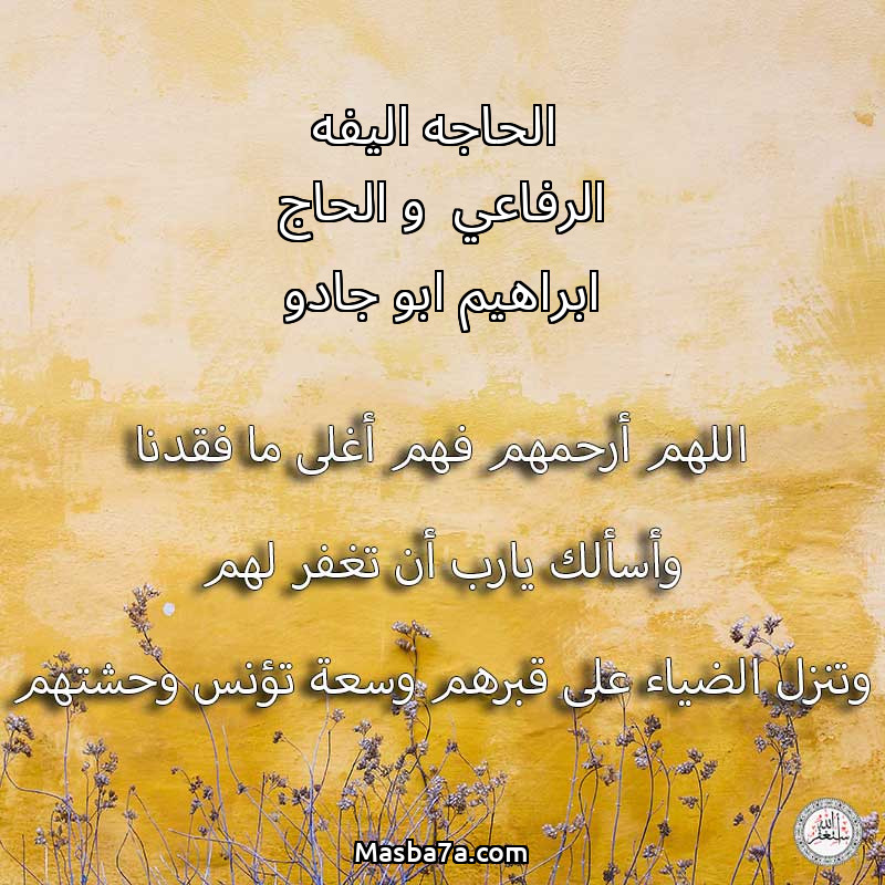 اللهم ارحم ( الحاجه اليفه الرفاعي و الحاج ابراهيم ابو جادو ) وانس وحشتهم واجمعنا بهم في جنتك ، اللهم ارحمهم بقدر شوقنا لهم اللهم ارحمهم واغفر لهم.