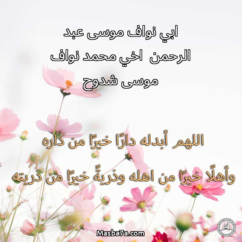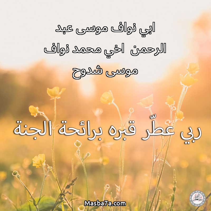 اللهم ارحم ( ابي نواف موسى عبد الرحمن اخي محمد نواف موسى شدوح ) وانس وحشته واجمعنا به في جنتك ، اللهم ارحمه بقدر شوقنا له اللهم ارحمه واغفر له .