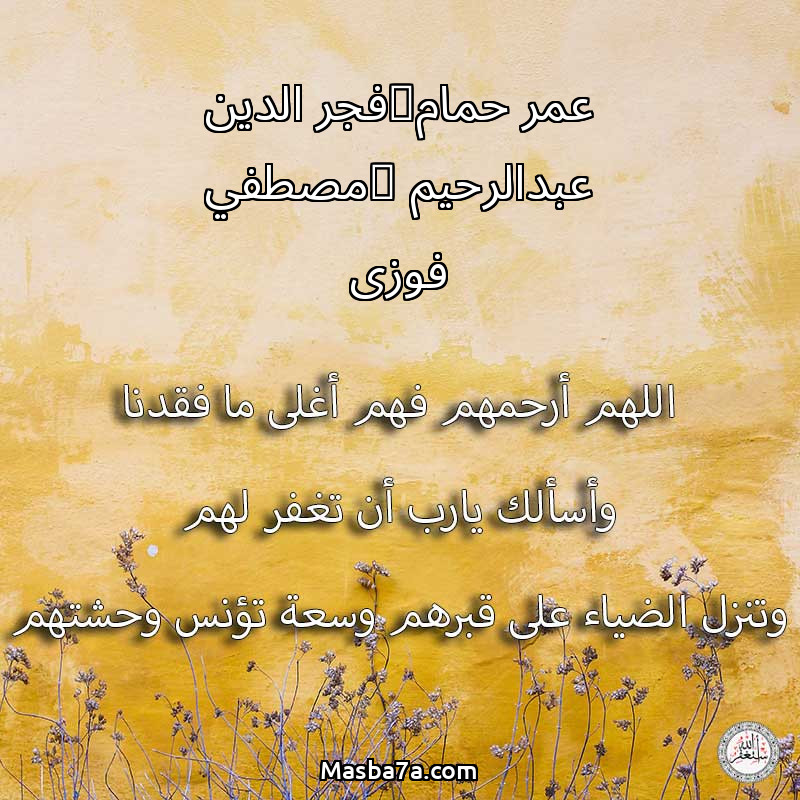 اللهم ارحم ( عمر حمام_فجر الدين عبدالرحيم _مصطفي فوزى ) وانس وحشتهم واجمعنا بهم في جنتك ، اللهم ارحمهم بقدر شوقنا لهم اللهم ارحمهم واغفر لهم.