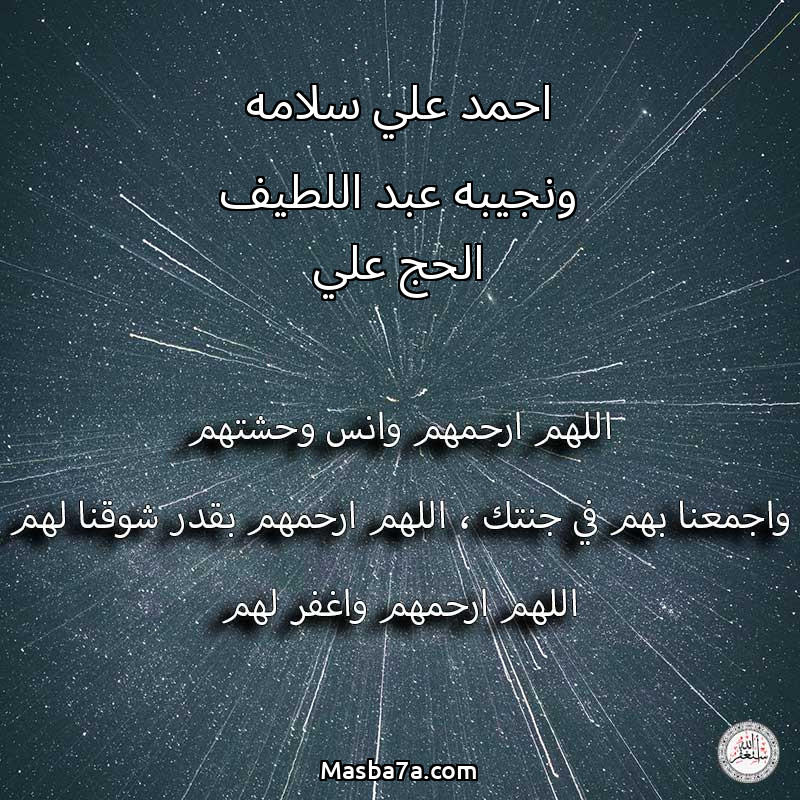 اللهم ارحم ( احمد علي سلامه ونجيبه عبد اللطيف الحج علي ) وانس وحشتهم واجمعنا بهم في جنتك ، اللهم ارحمهم بقدر شوقنا لهم اللهم ارحمهم واغفر لهم.