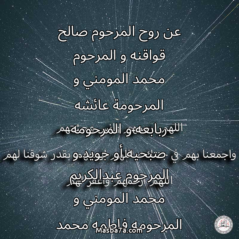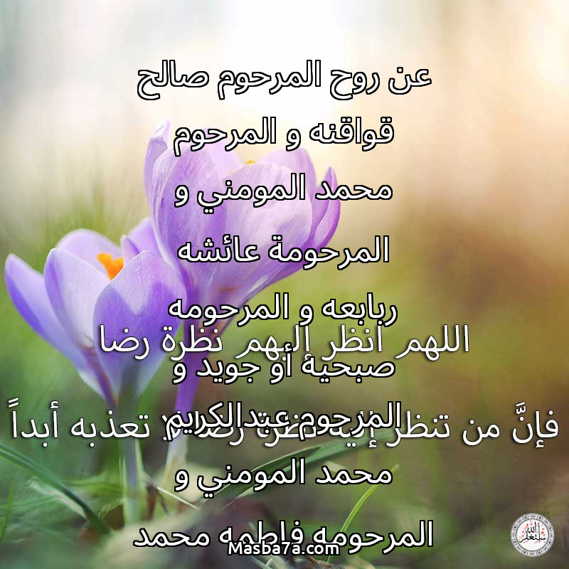 دعاء عن أرواح المرحومين عن روح المرحوم صالح قواقنه و المرحوم محمد المومني و المرحومة عائشه ربابعه و المرحومه صبحيه أو جويد و المرحوم عبدالكريم محمد المومني و المرحومه فاطمه محمد المومني و المرحومه هنا محمد المومني و المرحومه نجاح صالح قواقنه و المرحومه مريم صالح قواقنه و المرحوم مطلق قواقنه