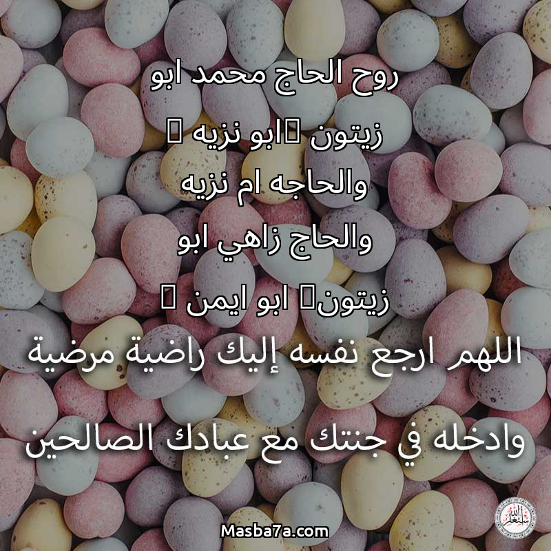 اللهم ارحم ( روح الحاج محمد ابو زيتون (ابو نزيه ) والحاجه ام نزيه والحاج زاهي ابو زيتون( ابو ايمن ) ) وانس وحشته واجمعنا به في جنتك ، اللهم ارحمه بقدر شوقنا له اللهم ارحمه واغفر له .