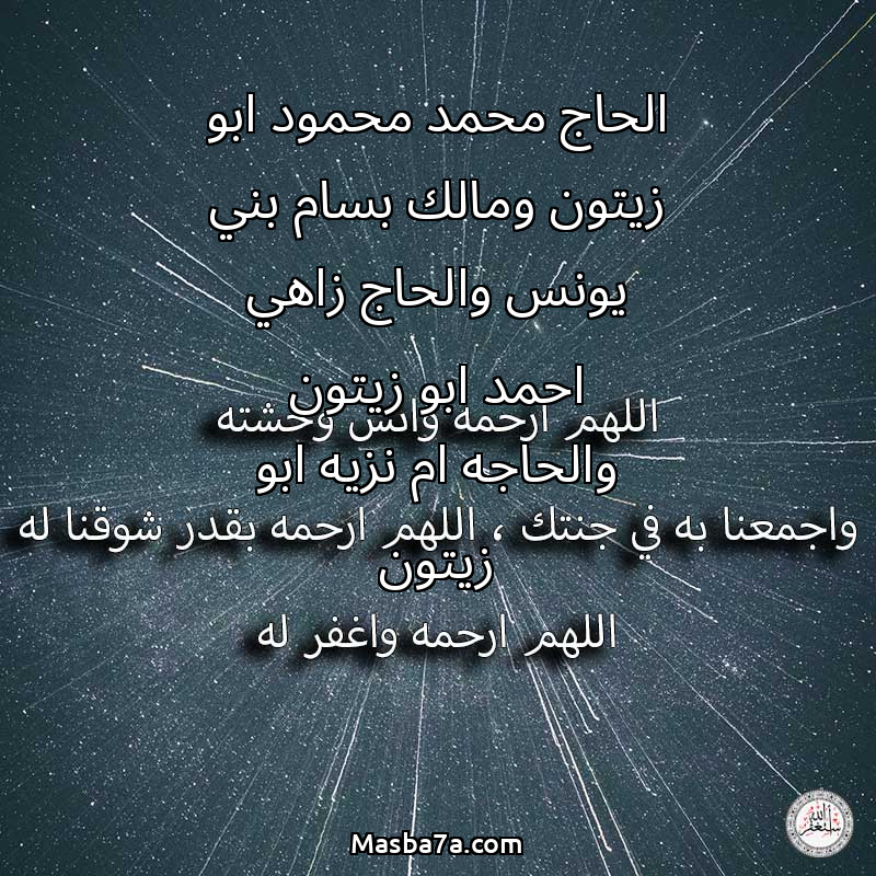 دعاء عن روح المرحوم الحاج محمد محمود ابو زيتون ومالك بسام بني يونس والحاج زاهي احمد ابو زيتون والحاجه ام نزيه ابو زيتون