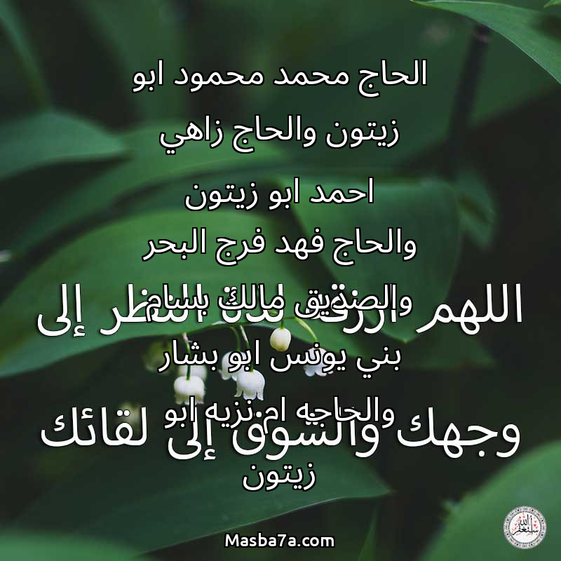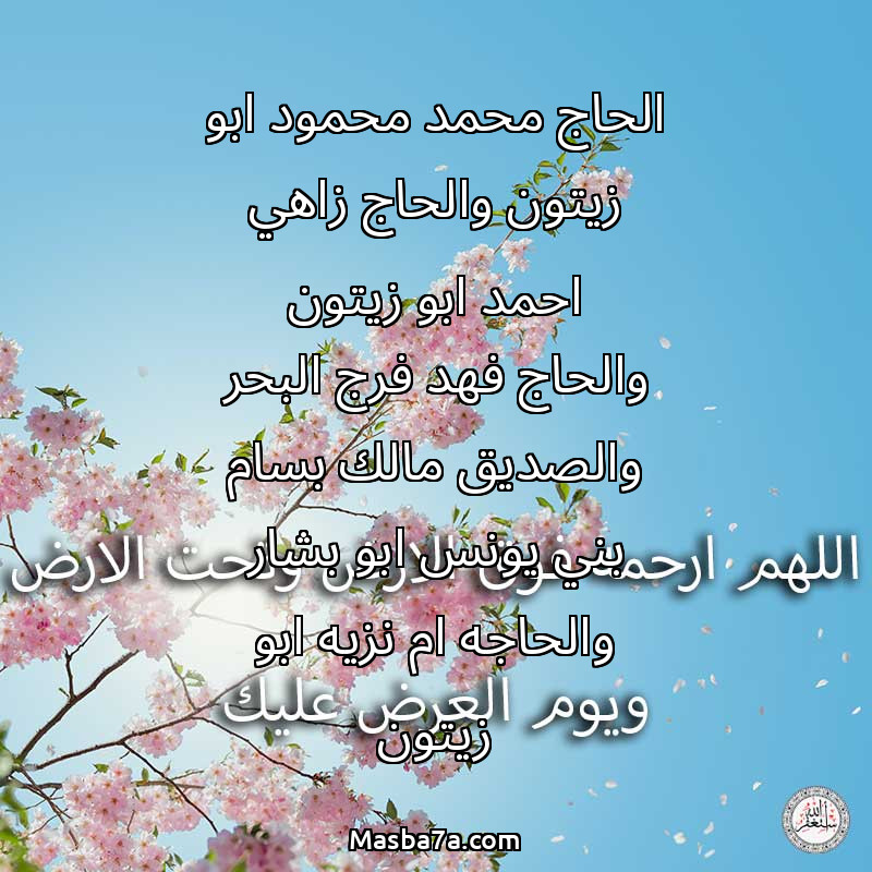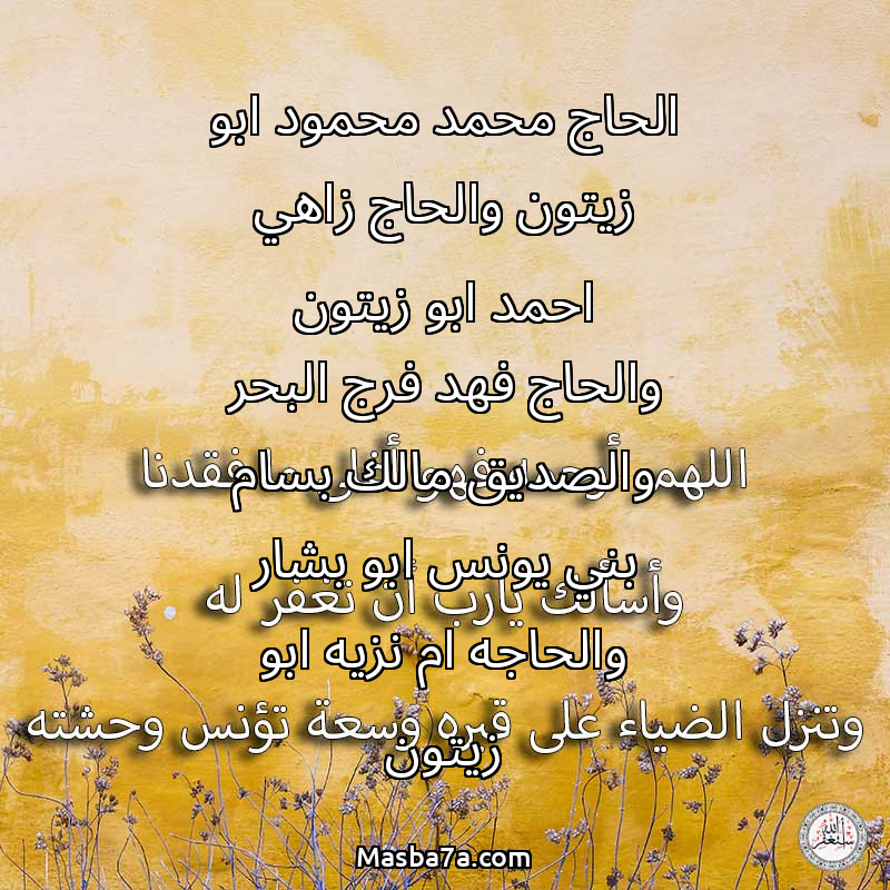 دعاء عن روح المرحوم الحاج محمد محمود ابو زيتون والحاج زاهي احمد ابو زيتون والحاج فهد فرج البحر والصديق مالك بسام بني يونس ابو بشار والحاجه ام نزيه ابو زيتون