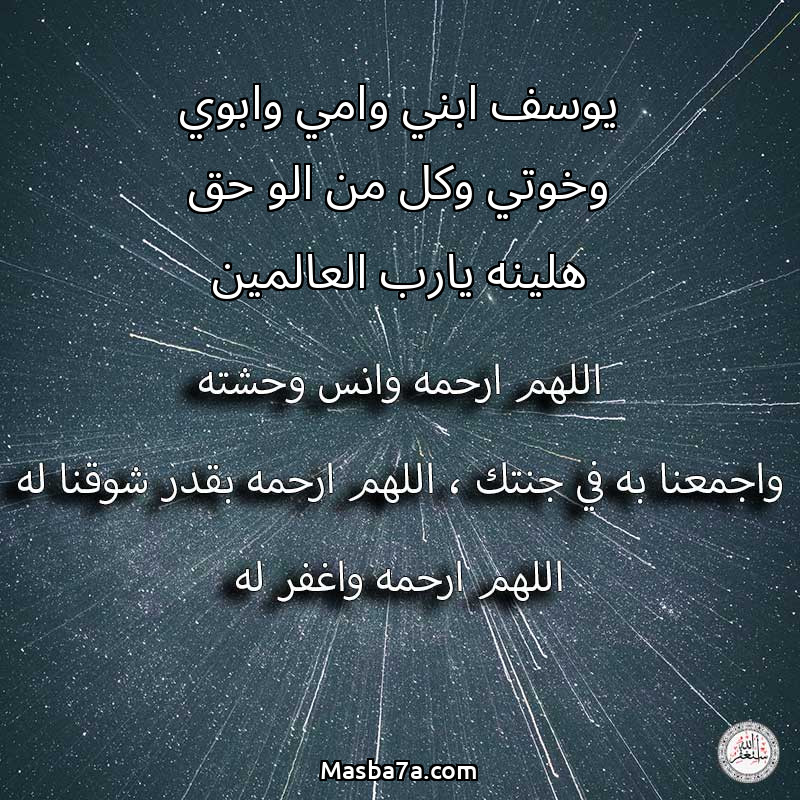 اللهم ارحم ( يوسف ابني وامي وابوي وخوتي وكل من الو حق هلينه يارب العالمين ) وانس وحشته واجمعنا به في جنتك ، اللهم ارحمه بقدر شوقنا له اللهم ارحمه واغفر له .