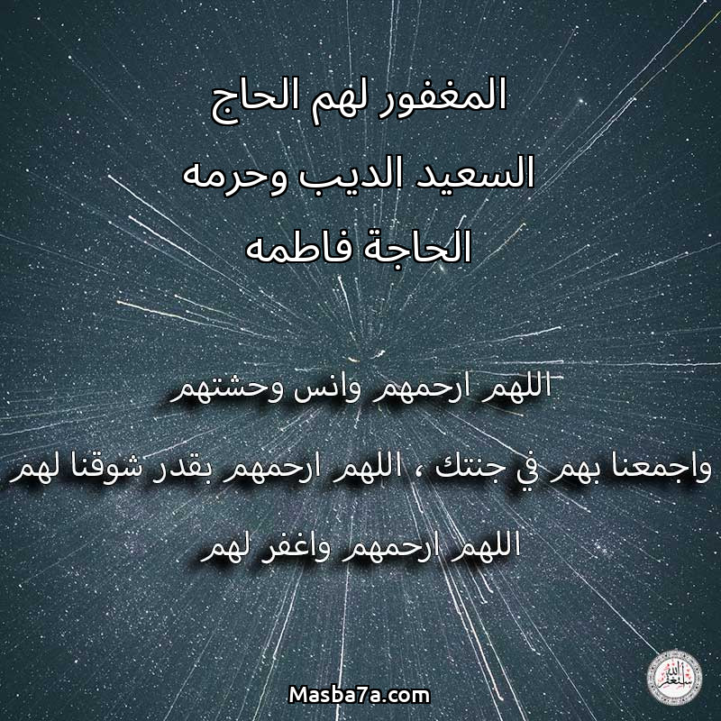 اللهم ارحم ( المغفور لهم الحاج السعيد الديب وحرمه الحاجة فاطمه ) وانس وحشتهم واجمعنا بهم في جنتك ، اللهم ارحمهم بقدر شوقنا لهم اللهم ارحمهم واغفر لهم.