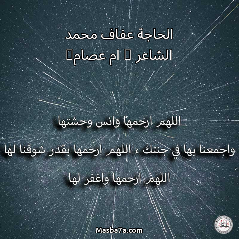 اللهم ارحم ( الحاجة عفاف محمد الشاعر ( ام عصام) ) وانس وحشتها واجمعنا بها في جنتك ، اللهم ارحمها بقدر شوقنا لها اللهم ارحمها واغفر لها .