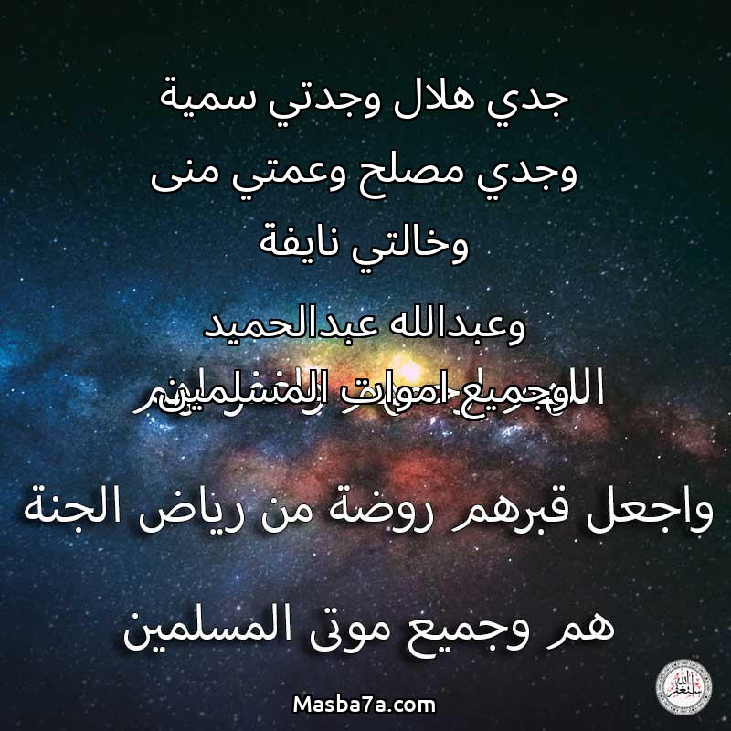 دعاء عن أرواح المرحومين جدي هلال وجدتي سمية وجدي مصلح وعمتي منى وخالتي نايفة وعبدالله عبدالحميد وجميع اموات المسلمين
