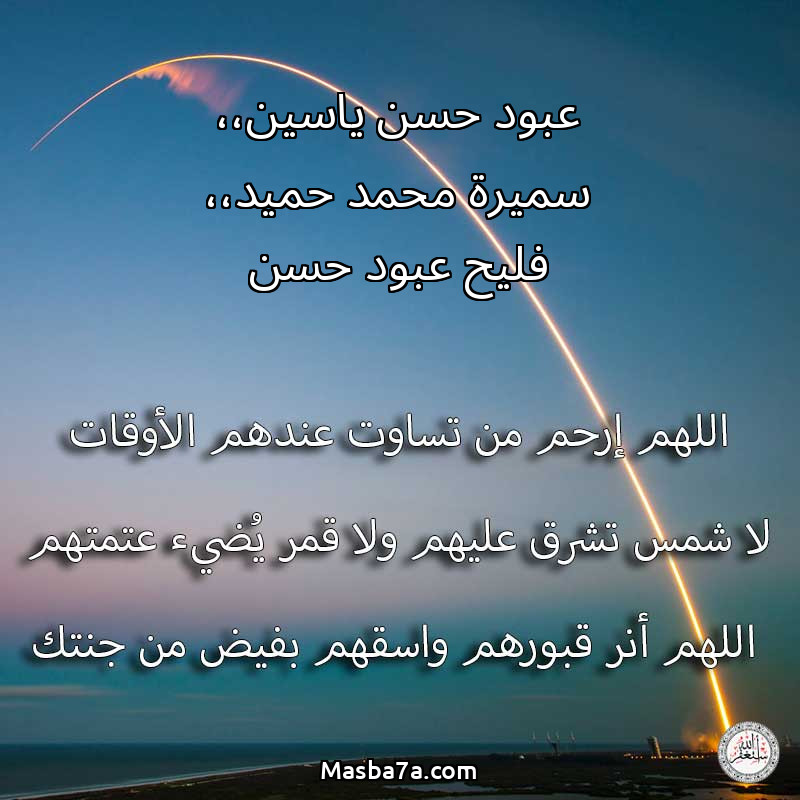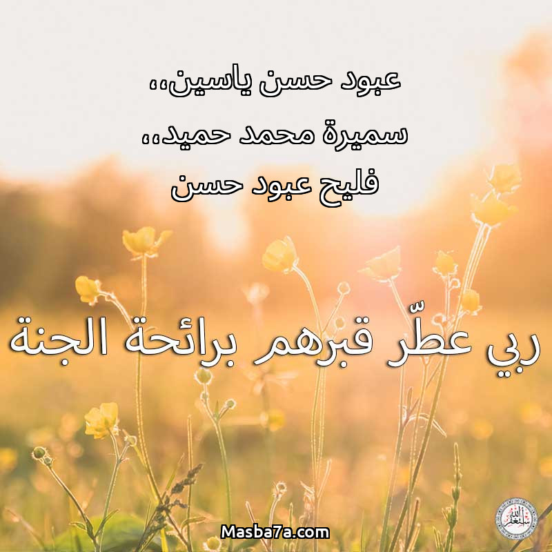 اللهم ارحم ( عبود حسن ياسين،، سميرة محمد حميد،، فليح عبود حسن ) وانس وحشتهم واجمعنا بهم في جنتك ، اللهم ارحمهم بقدر شوقنا لهم اللهم ارحمهم واغفر لهم.