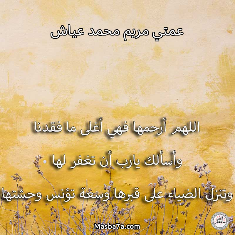 اللهم ارحم ( عمتي مريم محمد عياش ) وانس وحشتها واجمعنا بها في جنتك ، اللهم ارحمها بقدر شوقنا لها اللهم ارحمها واغفر لها .