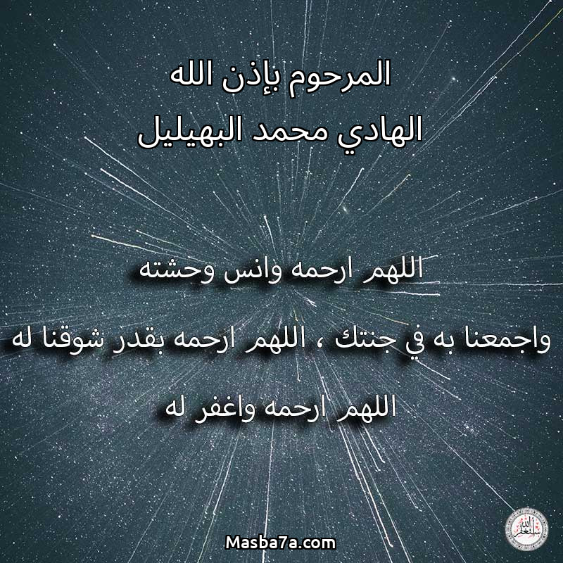 اللهم ارحم ( المرحوم بإذن الله الهادي محمد البهيليل ) وانس وحشته واجمعنا به في جنتك ، اللهم ارحمه بقدر شوقنا له اللهم ارحمه واغفر له .