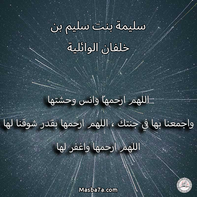 اللهم ارحم ( سليمة بنت سليم بن خلفان الوائلية ) وانس وحشتها واجمعنا بها في جنتك ، اللهم ارحمها بقدر شوقنا لها اللهم ارحمها واغفر لها .
