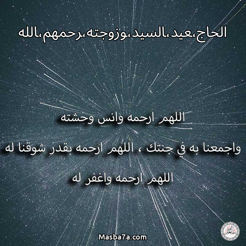 اللهم ارحم ( الحاج،عيد،السيد،وزوجته،رحمهم،الله ) وانس وحشته واجمعنا به في جنتك ، اللهم ارحمه بقدر شوقنا له اللهم ارحمه واغفر له .