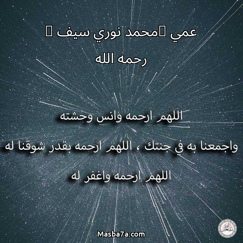 اللهم ارحم ( عمي (محمد نوري سيف ) رحمه الله ) وانس وحشته واجمعنا به في جنتك ، اللهم ارحمه بقدر شوقنا له اللهم ارحمه واغفر له .