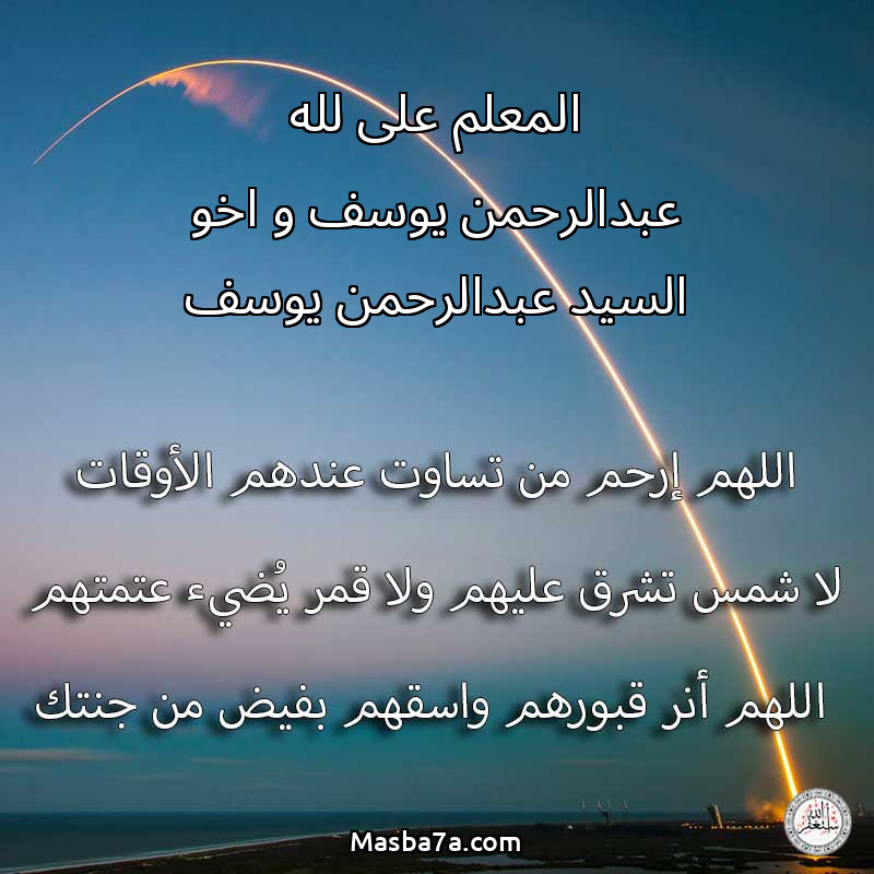 اللهم ارحم ( المعلم على لله عبدالرحمن يوسف و اخو السيد عبدالرحمن يوسف ) وانس وحشتهم واجمعنا بهم في جنتك ، اللهم ارحمهم بقدر شوقنا لهم اللهم ارحمهم واغفر لهم.
