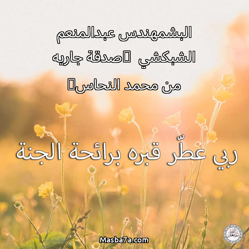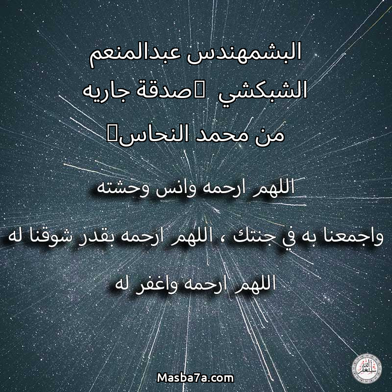 اللهم ارحم ( البشمهندس عبدالمنعم الشبكشي (صدقة جاريه من محمد النحاس) ) وانس وحشته واجمعنا به في جنتك ، اللهم ارحمه بقدر شوقنا له اللهم ارحمه واغفر له .