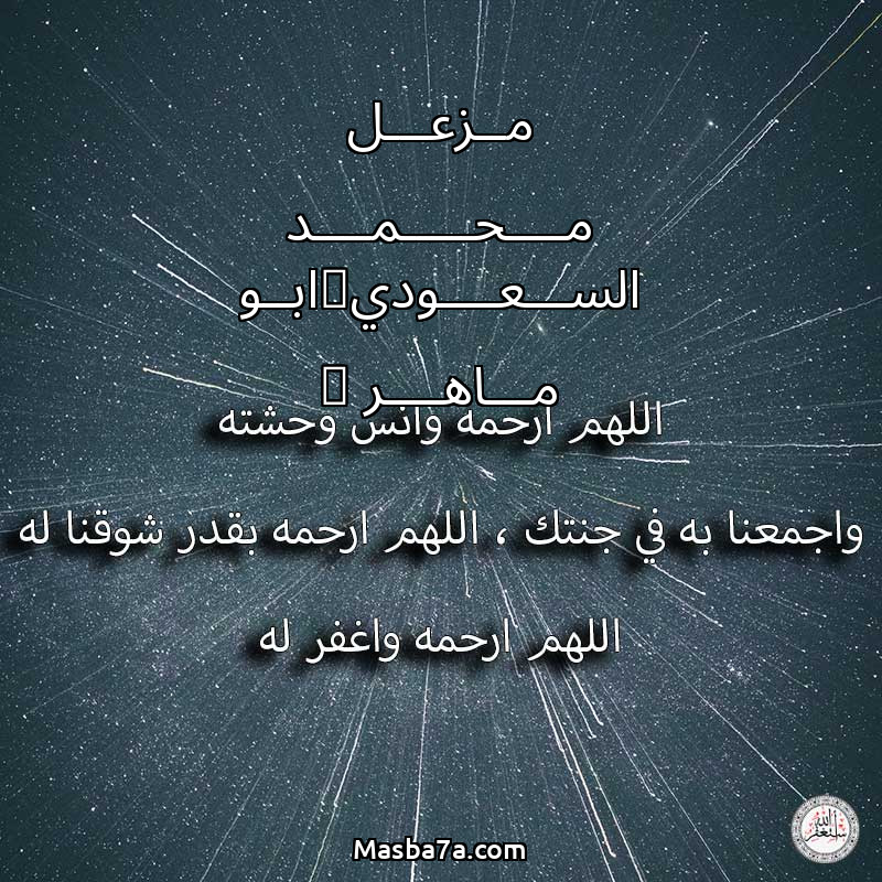 اللهم ارحم ( مــزعـــل مــــحـــــمــــد الســـعــــودي"ابــو مـــاهــــر " ) وانس وحشته واجمعنا به في جنتك ، اللهم ارحمه بقدر شوقنا له اللهم ارحمه واغفر له .