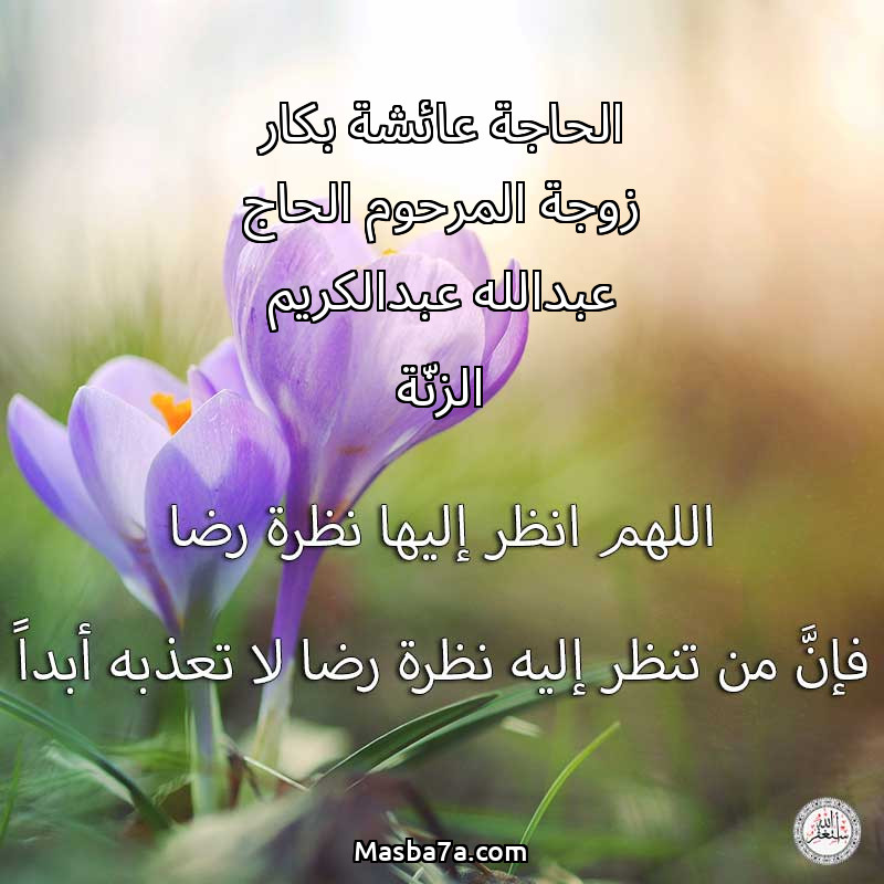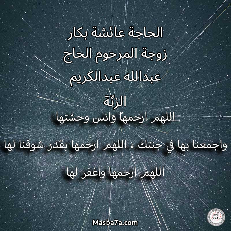 دعاء عن روح المرحومة الحاجة عائشة بكار زوجة المرحوم الحاج عبدالله عبدالكريم الزنّة