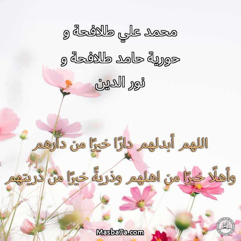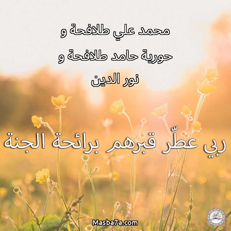 اللهم ارحم ( محمد علي طلافحة و حورية حامد طلافحة و نور الدين ) وانس وحشتهم واجمعنا بهم في جنتك ، اللهم ارحمهم بقدر شوقنا لهم اللهم ارحمهم واغفر لهم.