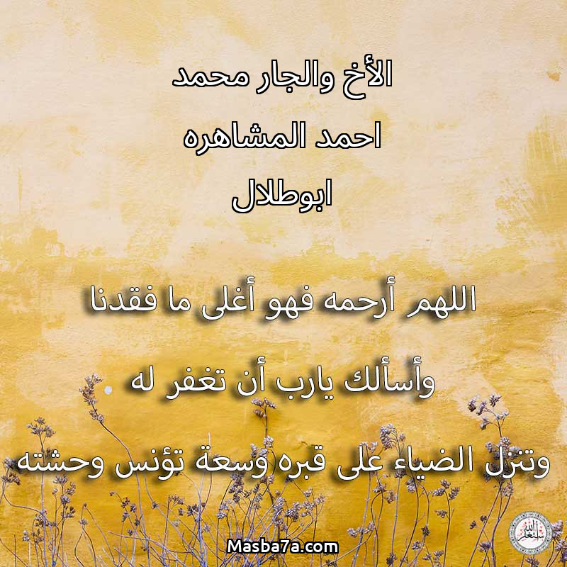 اللهم ارحم ( الأخ والجار محمد احمد المشاهره ابوطلال ) وانس وحشته واجمعنا به في جنتك ، اللهم ارحمه بقدر شوقنا له اللهم ارحمه واغفر له .