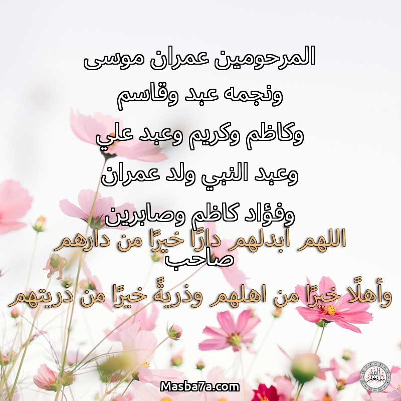 دعاء عن أرواح المرحومين المرحومين عمران موسى ونجمه عبد وقاسم وكاظم وكريم وعبد علي وعبد النبي ولد عمران وفؤاد كاظم وصابرين صاحب