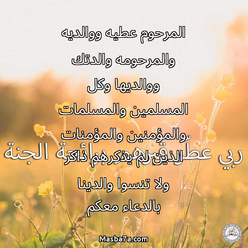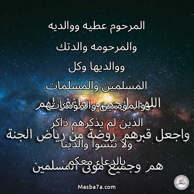 دعاء عن أرواح المرحومين المرحوم عطيه ووالديه والمرحومه والدتك ووالديها وكل المسلمين والمسلمات والمؤمنين والمؤمنات الذين لم يذكرهم ذاكر ولا تنسوا والدينا بالدعاء معكم