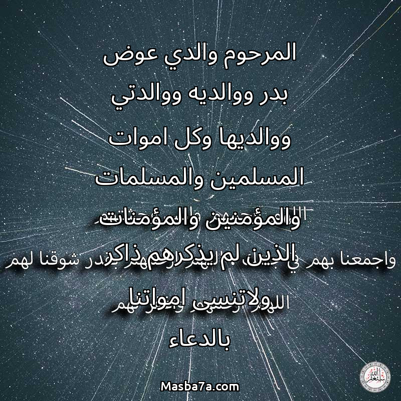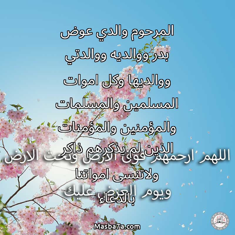 دعاء عن أرواح المرحومين المرحوم والدي عوض بدر ووالديه ووالدتي ووالديها وكل اموات المسلمين والمسلمات والمؤمنين والمؤمنات الذين لم يذكرهم ذاكر ولاتنسى امواتنا بالدعاء