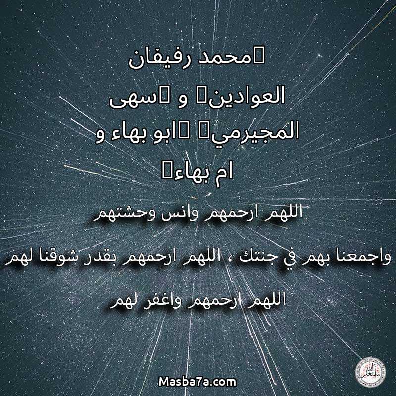 اللهم ارحم ( "محمد رفيفان العوادين" و "سهى المجيرمي" (ابو بهاء و ام بهاء) ) وانس وحشتهم واجمعنا بهم في جنتك ، اللهم ارحمهم بقدر شوقنا لهم اللهم ارحمهم واغفر لهم.