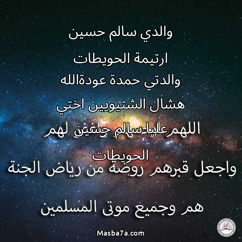 اللهم ارحم ( والدي سالم حسين ارتيمة الحويطات والدتي حمدة عودةالله هشال الشتيويين اختي عليا سالم حسين الحويطات ) وانس وحشتهم واجمعنا بهم في جنتك ، اللهم ارحمهم بقدر شوقنا لهم اللهم ارحمهم واغفر لهم.