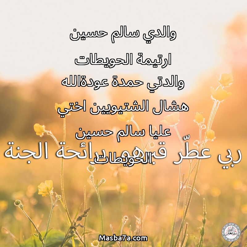 دعاء عن أرواح المرحومين والدي سالم حسين ارتيمة الحويطات والدتي حمدة عودةالله هشال الشتيويين اختي عليا سالم حسين الحويطات