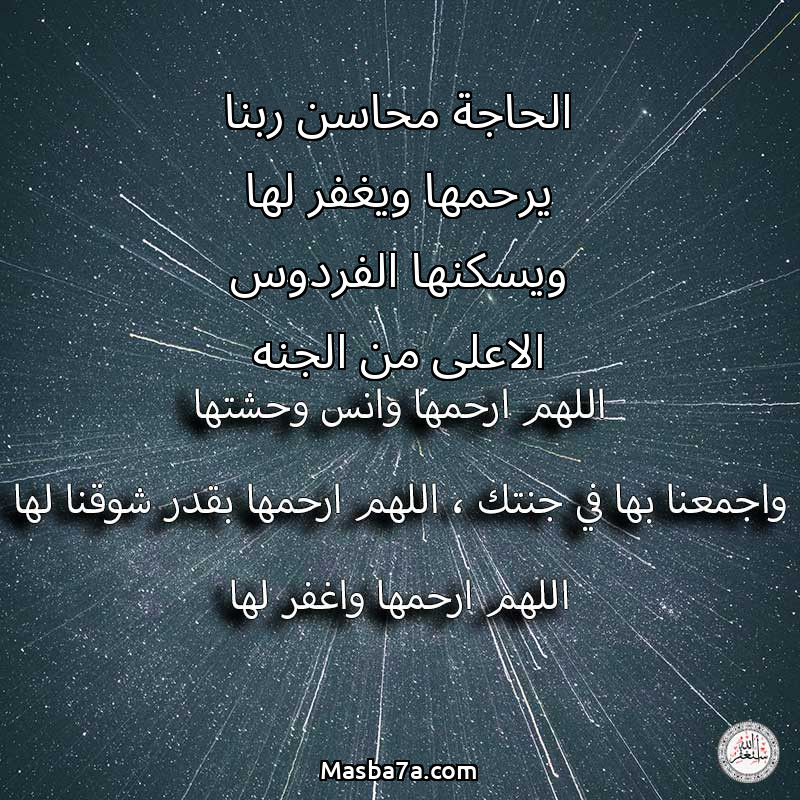 اللهم ارحم ( الحاجة محاسن ربنا يرحمها ويغفر لها ويسكنها الفردوس الاعلى من الجنه ) وانس وحشتها واجمعنا بها في جنتك ، اللهم ارحمها بقدر شوقنا لها اللهم ارحمها واغفر لها .