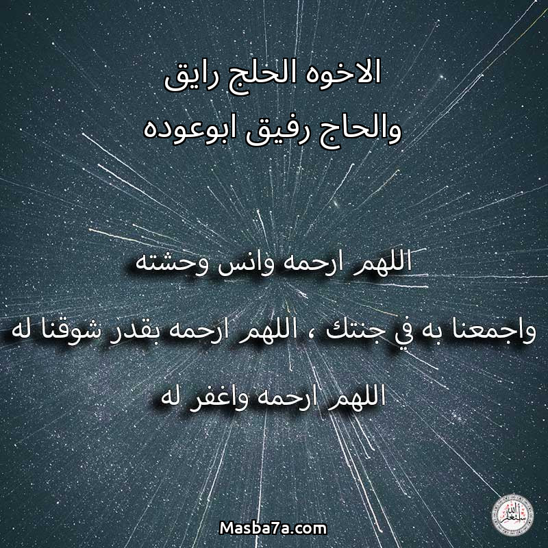 اللهم ارحم ( الاخوه الحلج رايق والحاج رفيق ابوعوده ) وانس وحشته واجمعنا به في جنتك ، اللهم ارحمه بقدر شوقنا له اللهم ارحمه واغفر له .