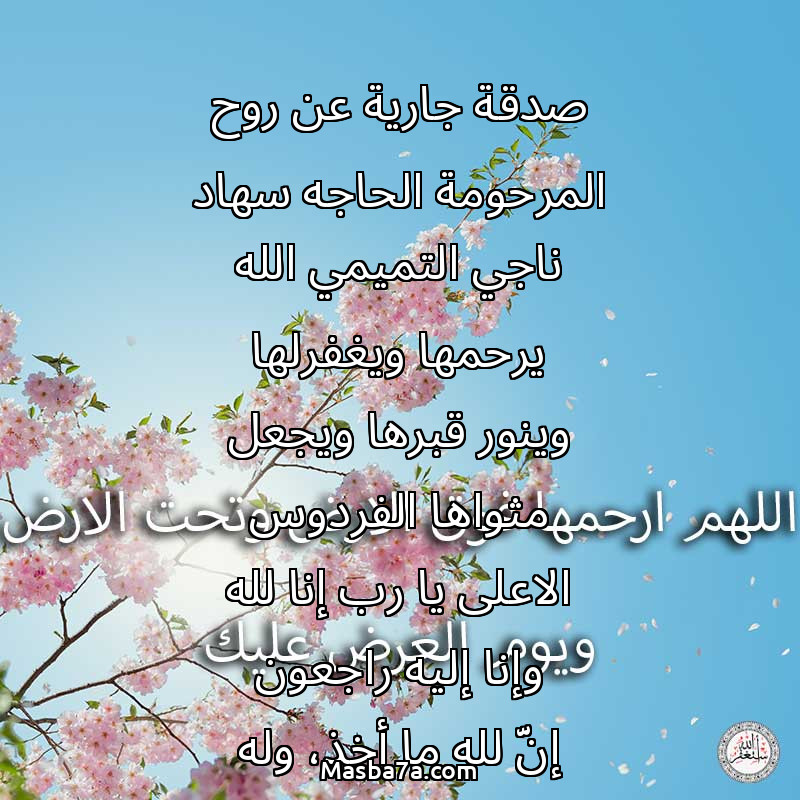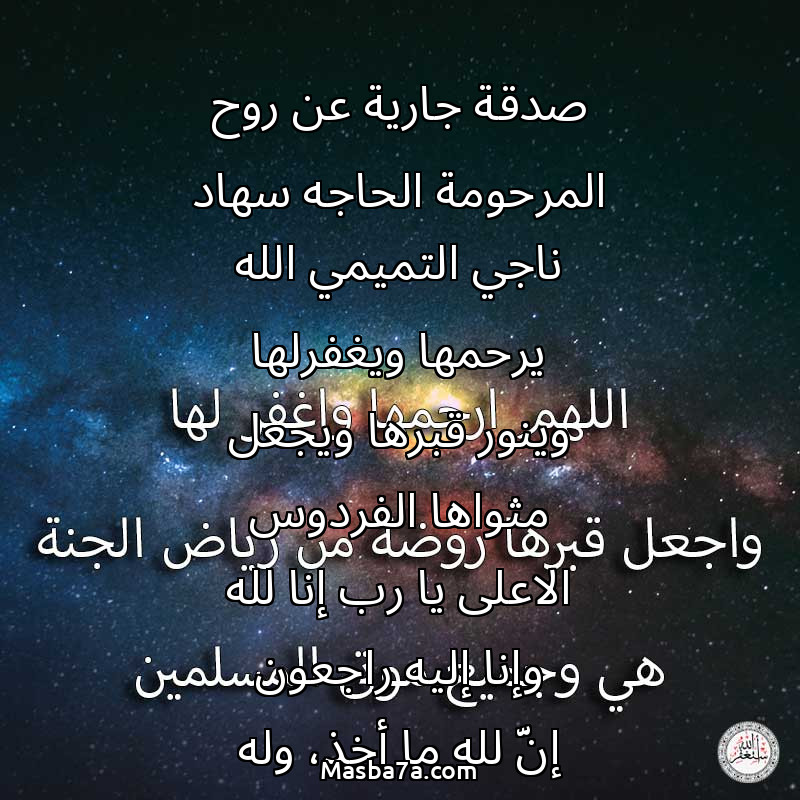 صدقة جارية عن روح المرحومة الحاجه سهاد ناجي التميمي الله يرحمها ويغفرلها وينور قبرها ويجعل مثواها الفردوس الاعلى يا رب إنا لله وإنا إليه راجعون إنَّ لله ما أخذ، وله ما أعطى، وكلٌّ عنده بأجلٍ مُسمّى، فلتصبر ولتحتسب