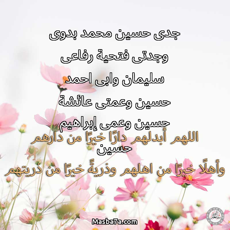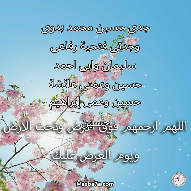دعاء عن أرواح المرحومين جدى حسين محمد بدوى وجدتى فتحية رفاعى سليمان وابى احمد حسين وعمتى عائشة حسين وعمى إبراهيم حسين