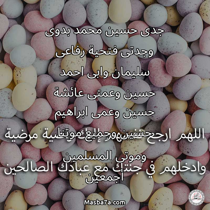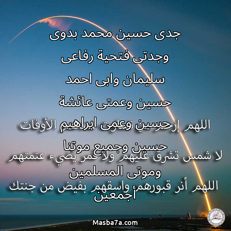 اللهم ارحم ( جدى حسين محمد بدوى وجدتى فتحية رفاعى سليمان وابى احمد حسين وعمتى عائشة حسين وعمى ابراهيم حسين وجميع موتنا وموتى المسلمين أجمعين ) وانس وحشتهم واجمعنا بهم في جنتك ، اللهم ارحمهم بقدر شوقنا لهم اللهم ارحمهم واغفر لهم.