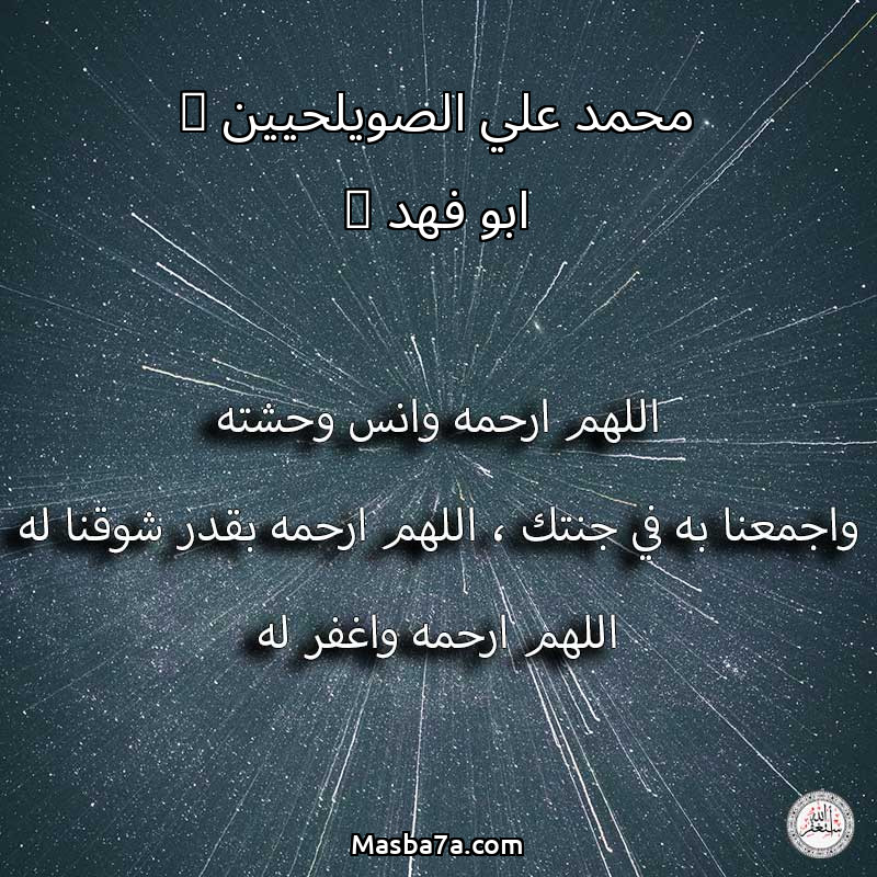 اللهم ارحم ( محمد علي الصويلحيين { ابو فهد } ) وانس وحشته واجمعنا به في جنتك ، اللهم ارحمه بقدر شوقنا له اللهم ارحمه واغفر له .