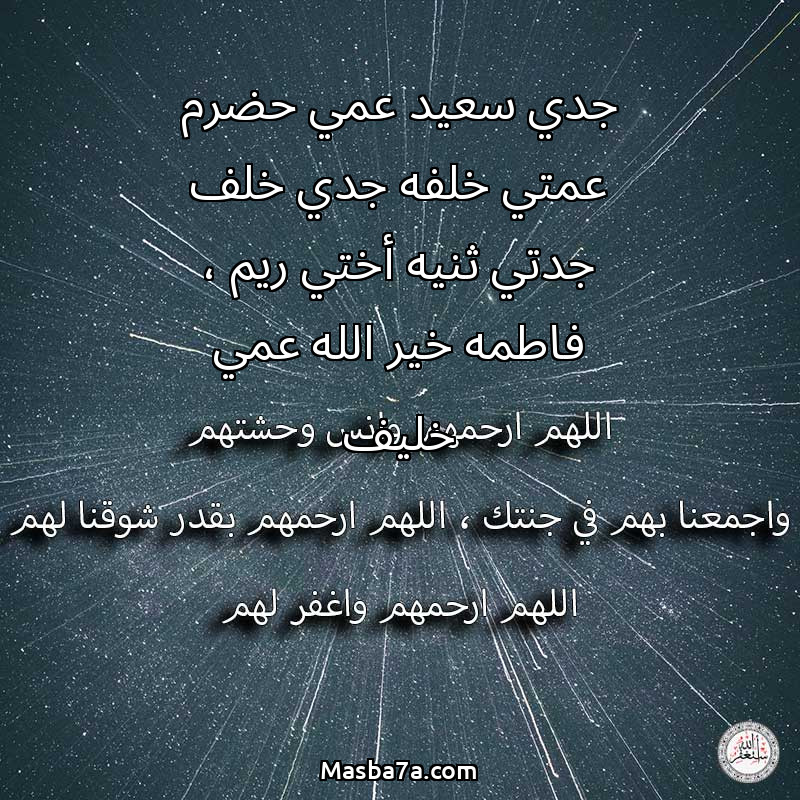 اللهم ارحم ( جدي سعيد عمي حضرم عمتي خلفه جدي خلف جدتي ثنيه أختي ريم ، فاطمه خير الله عمي خليف ) وانس وحشتهم واجمعنا بهم في جنتك ، اللهم ارحمهم بقدر شوقنا لهم اللهم ارحمهم واغفر لهم.
