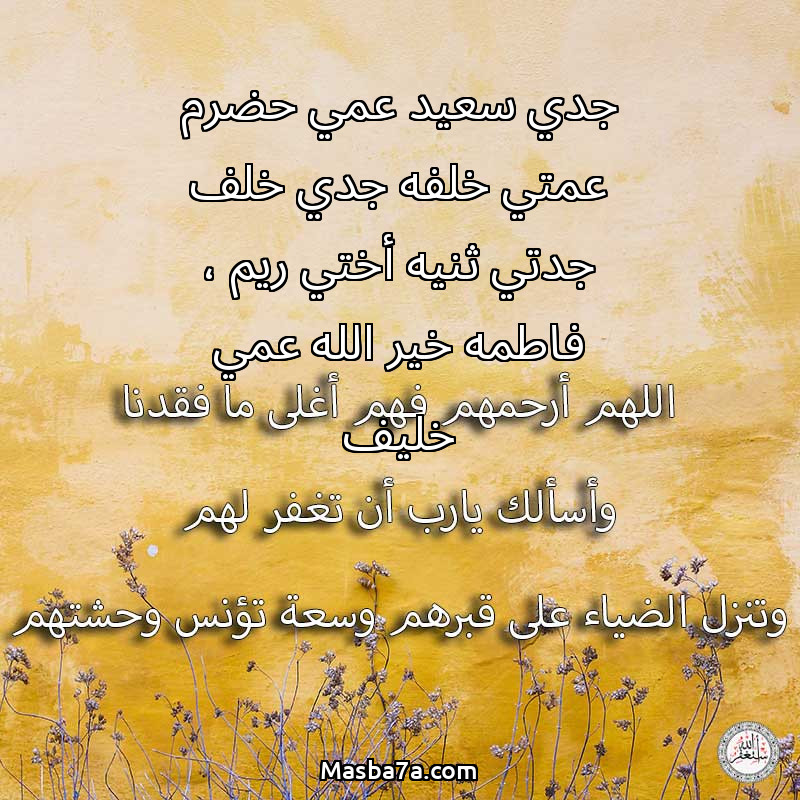 دعاء عن أرواح المرحومين جدي سعيد عمي حضرم عمتي خلفه جدي خلف جدتي ثنيه أختي ريم ، فاطمه خير الله عمي خليف