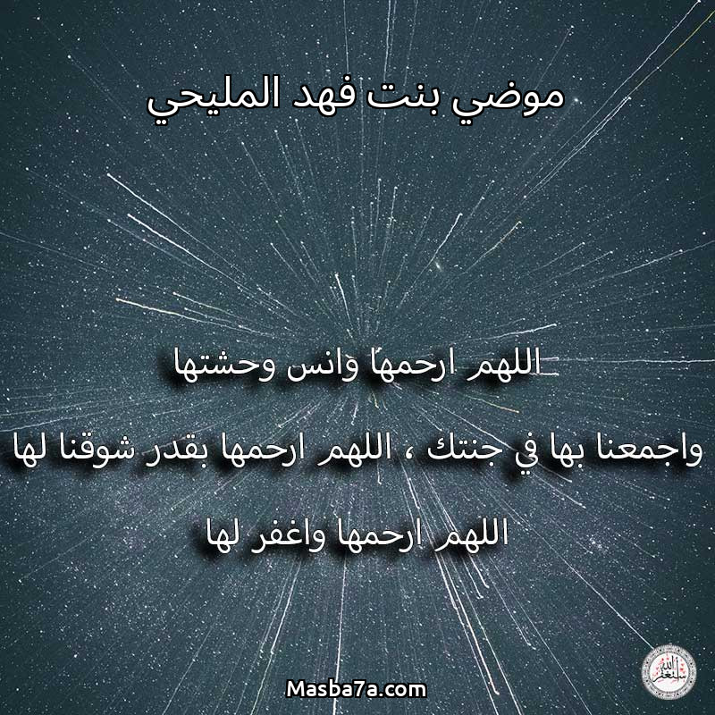 اللهم ارحم ( موضي بنت فهد المليحي ) وانس وحشتها واجمعنا بها في جنتك ، اللهم ارحمها بقدر شوقنا لها اللهم ارحمها واغفر لها .