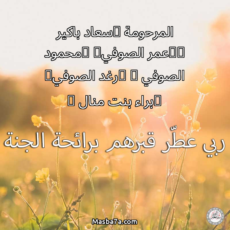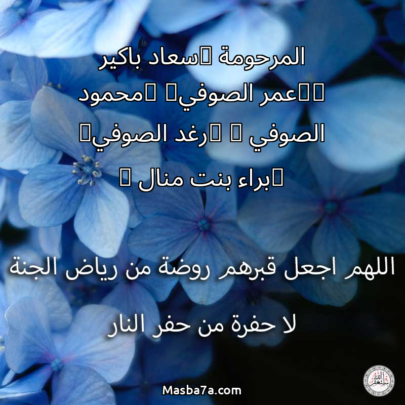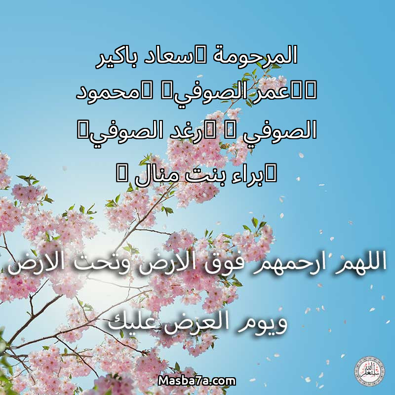 اللهم ارحم ( المرحومة (سعاد باكير )(عمر الصوفي) (محمود الصوفي ) (رغد الصوفي) (براء بنت منال ) ) وانس وحشتهم واجمعنا بهم في جنتك ، اللهم ارحمهم بقدر شوقنا لهم اللهم ارحمهم واغفر لهم.