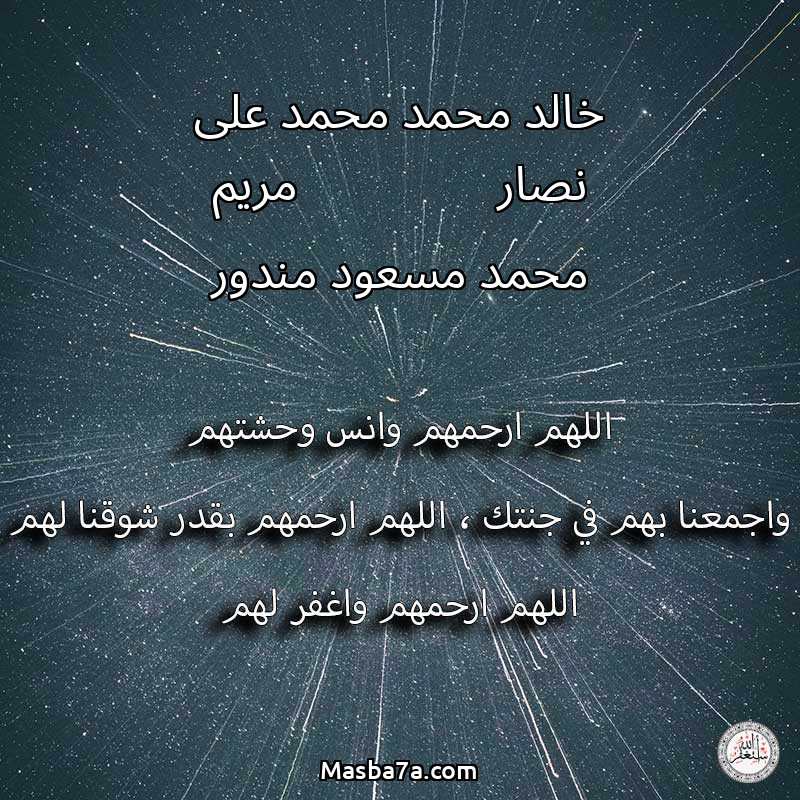 اللهم ارحم ( خالد محمد محمد على نصار مريم محمد مسعود مندور ) وانس وحشتهم واجمعنا بهم في جنتك ، اللهم ارحمهم بقدر شوقنا لهم اللهم ارحمهم واغفر لهم.