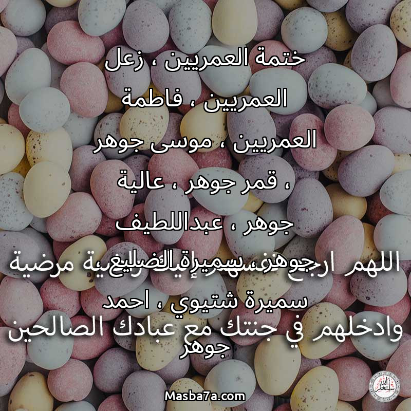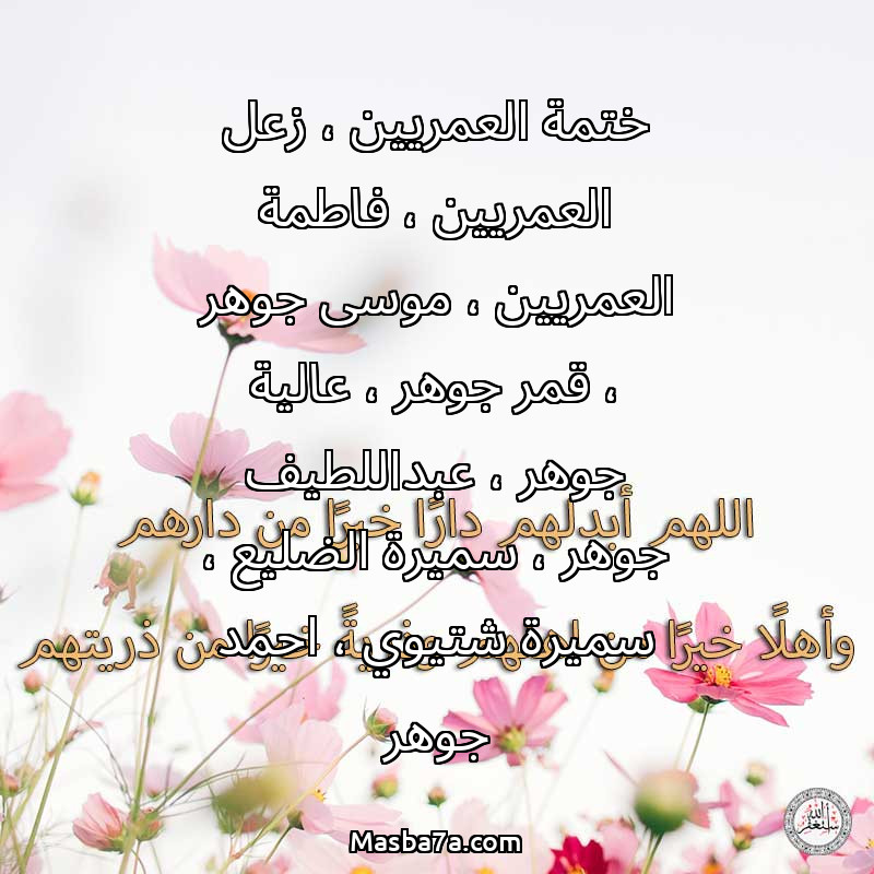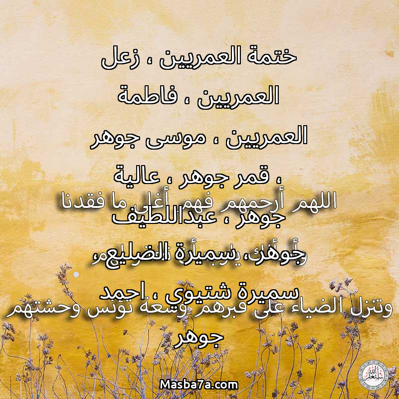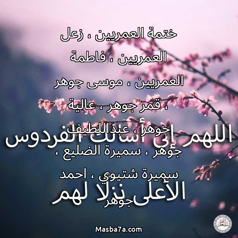 دعاء عن أرواح المرحومين ختمة العمريين ، زعل العمريين ، فاطمة العمريين ، موسى جوهر ، قمر جوهر ، عالية جوهر ، عبداللطيف جوهر ، سميرة الضليع ، سميرة شتيوي ، احمد جوهر