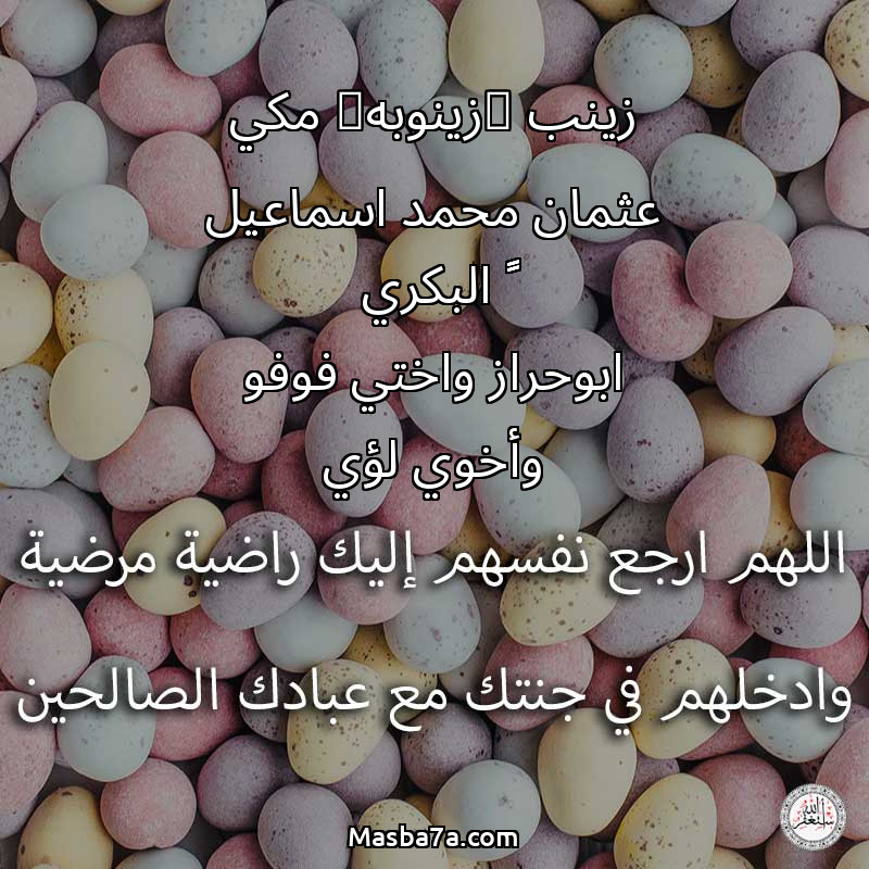 اللهم ارحم ( زينب (زينوبه) مكي عثمان محمد اسماعيل ﺍﻟﺸﻴﺦ البكري ابوحراز واختي فوفو وأخوي لؤي ) وانس وحشتهم واجمعنا بهم في جنتك ، اللهم ارحمهم بقدر شوقنا لهم اللهم ارحمهم واغفر لهم.
