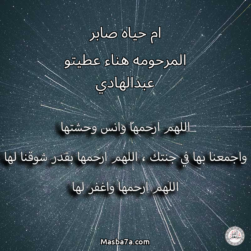اللهم ارحم ( ام حياه صابر المرحومه هناء عطيتو عبدالهادي ) وانس وحشتها واجمعنا بها في جنتك ، اللهم ارحمها بقدر شوقنا لها اللهم ارحمها واغفر لها .