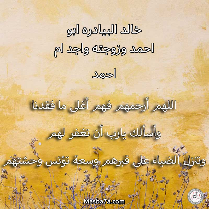 اللهم ارحم ( خالد البيادره ابو احمد وزوجته واجد ام احمد ) وانس وحشتهم واجمعنا بهم في جنتك ، اللهم ارحمهم بقدر شوقنا لهم اللهم ارحمهم واغفر لهم.