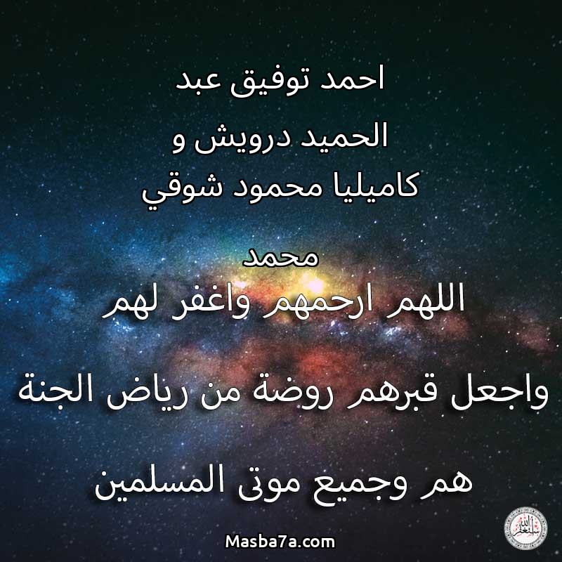 اللهم ارحم ( احمد توفيق عبد الحميد درويش و كاميليا محمود شوقي محمد ) وانس وحشتهم واجمعنا بهم في جنتك ، اللهم ارحمهم بقدر شوقنا لهم اللهم ارحمهم واغفر لهم.